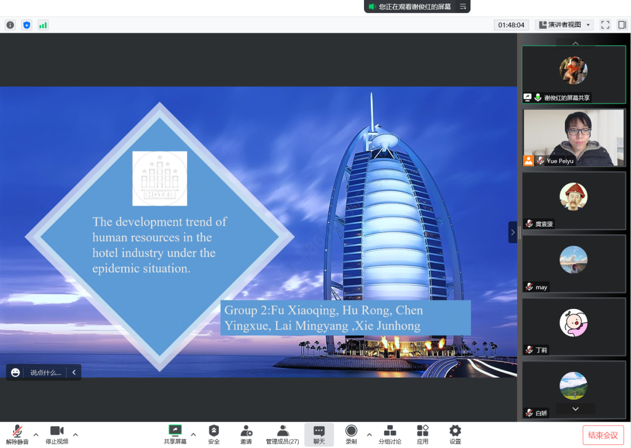 于2022年1月11日签订的院际友好协议,两院在硕、博项目的教研合作正在有序开展、稳步推进。2023年春季学期即将开展教学合作的另外两门课分别为何小东博士领衔的“Strategic Management for Tourism and Hospitality Business(TH7203)” 和刘婕博士领衔的“ Marketing management for Tourism and Hospitality Businesses(TH7201)”。