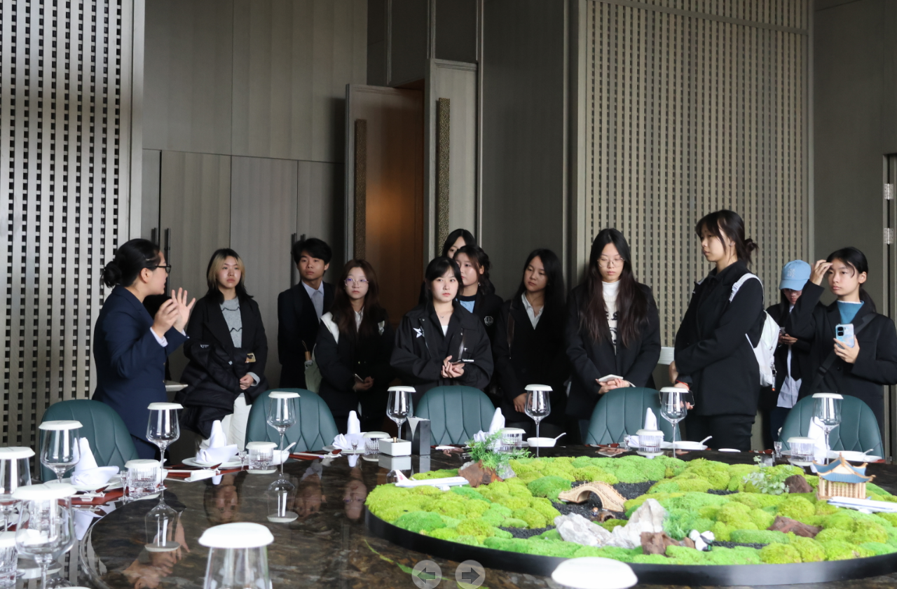 在酒店人力资源总监的引导下,同学们依次参观了酒店的大堂、客房、餐饮部、会议中心、康体设施及后台运营区域。从前台温馨专业的对客服务,到后厨高效严谨的标准化操作;从奢华精致的客房布置,到庞大复杂的后勤保障系统,同学们得以零距离接触国际品牌酒店的运营全貌。酒店各部门负责人担任“现场讲师”,为同学们详细讲解了服务流程、管理理念与科技应用,让大家对现代酒店管理的智能化、人性化与精细化有了直观而深刻的认识。