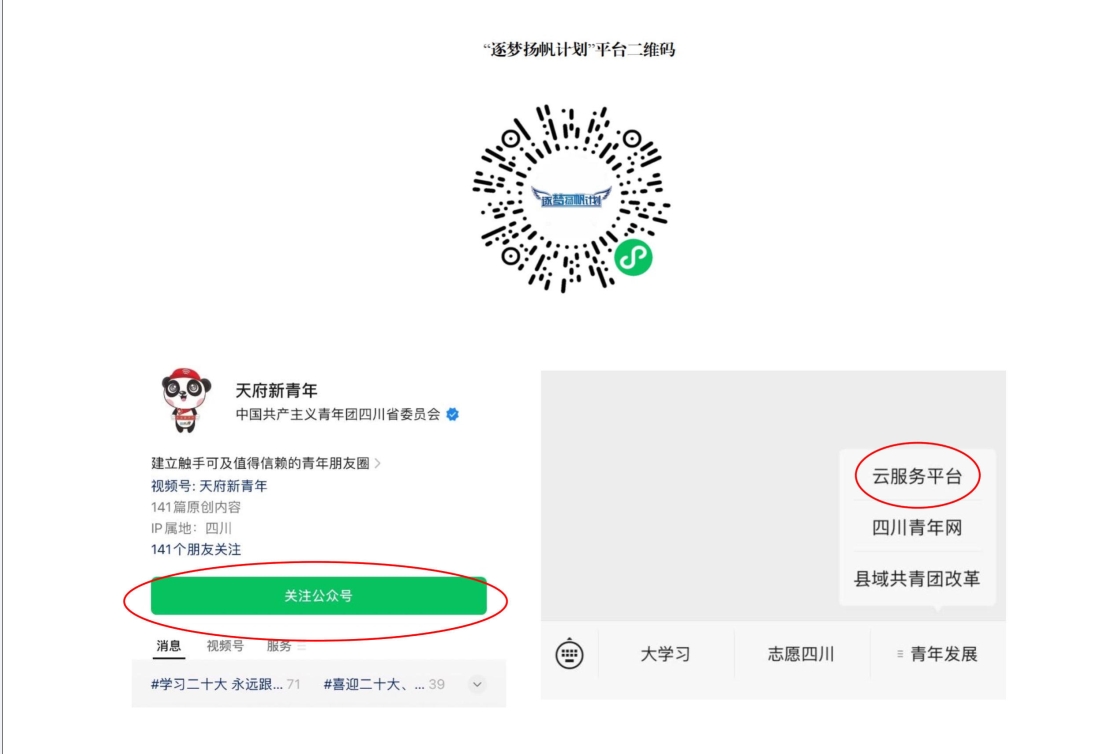 第一步:扫描平台小程序二维码或进入微信公众号关注“天府新青年”