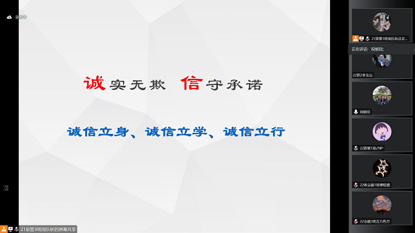 6月5日,我院以《扬诚信之帆 做时代新人》为主题,重点面向2022级受助学生开展诚信主题教育。资助辅导员祝郁欣老师从同学们最熟悉关心的考试谈起,强调了考试要求、考试纪律,介绍了违纪后可能面临的各项处罚;重点批评了本次期末考试中出现的违纪违规现象,分析了同学们的各种心理;从“诚信考试”谈到“诚信立身、诚信立学、诚信立行”。祝老师指出,学习与做人做事都应该一丝不苟,希望同学们认真踏实地学习,积极地参加实践锻炼,诚信为人,踏实做事,实干成才。