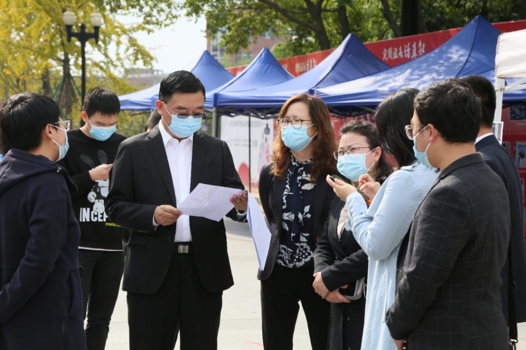 领导深入会场了解毕业生求职意向,关心学生求职需要。