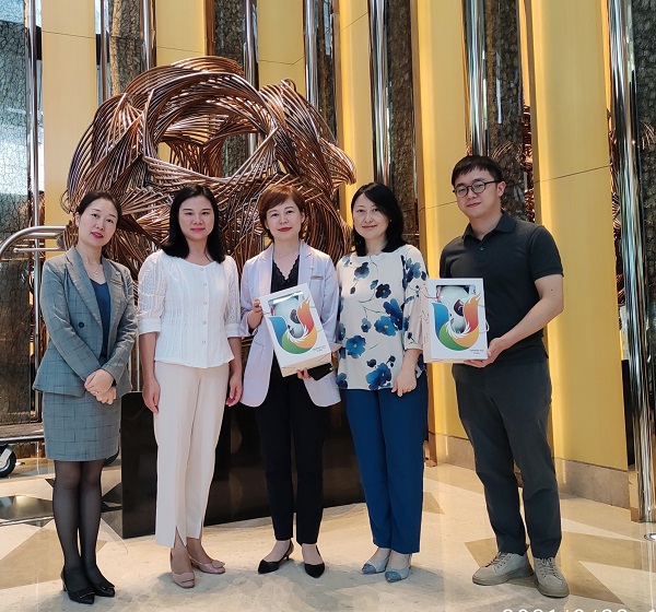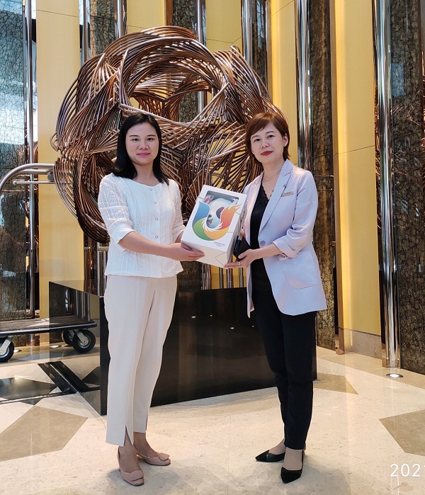 向酒店赠送了大运会吉祥物“蓉宝”,双方合影留念。