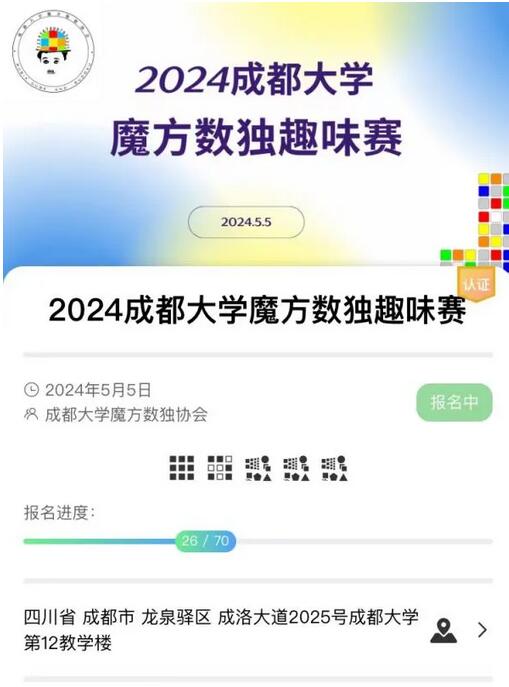 本次比赛由共青团成都大学委员会主办,成都大学魔方数独协会承办,于2024年5月5日下午2点至6点在成都大学12教举行。这次比赛不仅考验大家的逻辑思维和反应速度,还充满了趣味性和挑战性,比赛项目也丰富多样,包括三阶速拧、三阶单面、魔方克隆、魔方拼图以及魔方数独等。成都高校学全体学生均可报名参与,共同挑战自我,享受智力游戏的乐趣。
