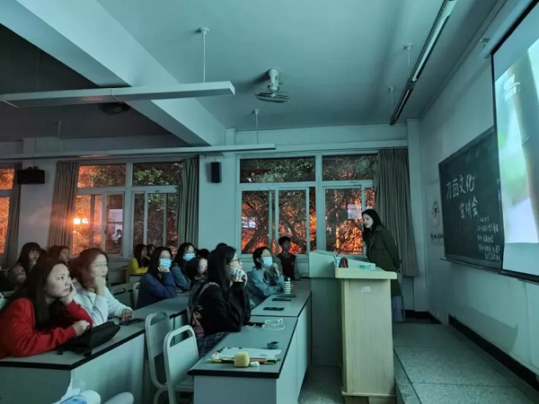 刀画宣传讲座则于4月19日晚7点半在5109开展。在非遗协会刀画部部长陈兴萍的主持下,各会员以及其他同学们开始了一场刀画文化的探寻之旅。这次讲座特别邀请到刀画的第四代传人杨金星老师作为主讲嘉宾,为同学们介绍刀画文化的来源、创造和深刻意味,尤其是其中蕴含的非遗文化魅力。从讲解中,同学们也了解到了刀画传承背后的故事,通过观看央视纪录片也感受到了石德成老师(金星老师的老师)在拜师学艺路程中的不易与毅力,同学们也被这份坚持不懈的精神深深打动。