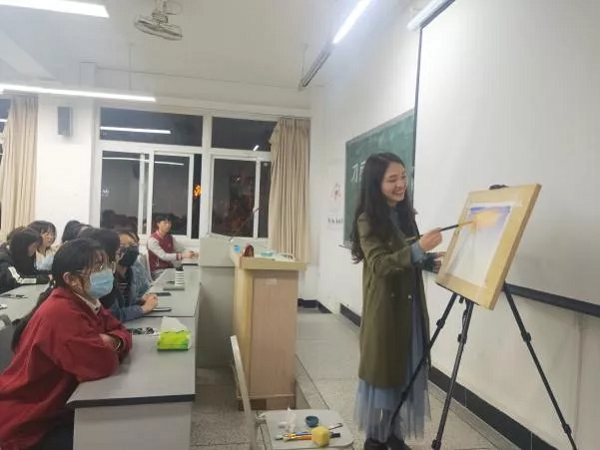 另外在讲座中设置了一个独特的刀画现场展示环节,金星老师也为同学们现场作画。从刀画的每一个基本元素包括天空、远山、草坪等详细讲解其中的笔触与色彩构图,最后一幅完整的刀画作品在短时间诞生出来,同学们不禁赞叹于刀画的魅力。最后在抽奖环节中,由非遗协会、会展协会负责人和金星老师分别抽取三至一等奖,奖品皆是与刀画相关的书签、原木片和现场画作,中奖的同学脸上都洋溢着笑容。我们也希望这些获奖的同学能真正地将刀画文化带到更多地方!