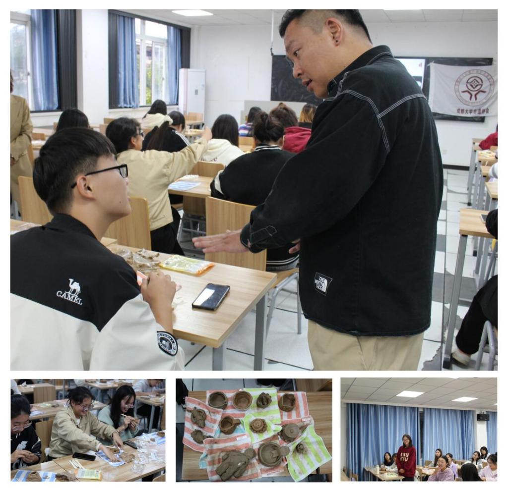 本次活动由协会指导老师眭老师主持开场,并向同学们简单介绍了特邀嘉宾刘涛老师。刘涛老师毕业于景德镇陶瓷大学陶瓷设计专业,是四川美协陶艺艺委会成员曾参与法蓝瓷设计展和爱马仕下属品牌“上下”茶具设计等。刘老师通过展示一件件精美的邛窑陶瓷作品,解读其中蕴含的文化符号和艺术价值,让同学们深刻感受到了传统文化的博大精深。在陶艺体验环节中,同学们积极参与,用自己的理解与巧思,捏造出各具特色的成品,充满了奇思妙想,展现出无限的创造力和想象力。