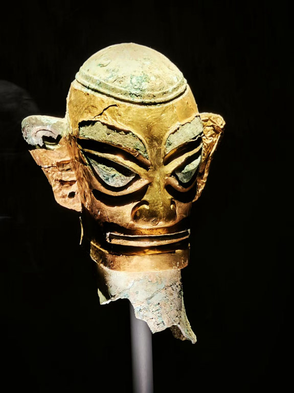活动当天,师生们跟随讲解员的带领,依次参观了三星堆博物馆“世纪逐梦”“巍然王都”“天地人神”三大主题展厅。青铜神树、黄金面具、青铜纵目人像……这些跨越三千年的文物不仅是古蜀文明的见证,更蕴含着与非遗技艺一脉相承的智慧。讲解员结合考古成果与非遗保护理念,生动解读了三星堆祭祀仪式中的传统文化。“青铜器上的纹饰与现代蜀绣图案异曲同工,或许可以成为非遗创新的灵感来源。”一位协会成员在观察青铜器纹样时提出设想。另一名同学则对黄金面具的锻造技艺充满兴趣:“这种古老的加工技术,能否通过非遗研培计划与现代金工技艺结合,开发出新的文创产品?”协会成员从非遗传承的视角,重新审视文物,深化了对文化遗产活态保护的理解。
