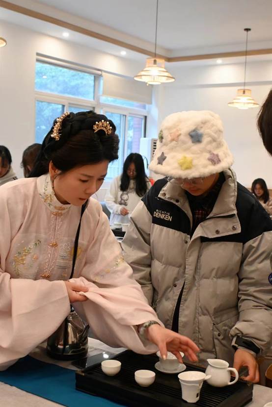 本次活动分为理论讲解和盖碗冲泡方法两个部分,首先由陈舒慧老师讲解明代泡茶法的起源和流程,明代的泡茶法起源于明太祖朱元璋,他废除了进贡龙团贡茶而改为贡散茶,点茶法随之衰落,唐煎宋点饮法变成了沸水冲泡的瀹饮法。其次讲解现代工夫茶,现代功夫茶的起源可以追溯到中国福建地区,距今已有几百年的历史,随着时间的推移,泡茶的方式逐渐被人们归纳总结为“工夫”,同时也被视作一种文化的象征,代表着中国人文化的深厚底蕴和生活方式的精致品味。