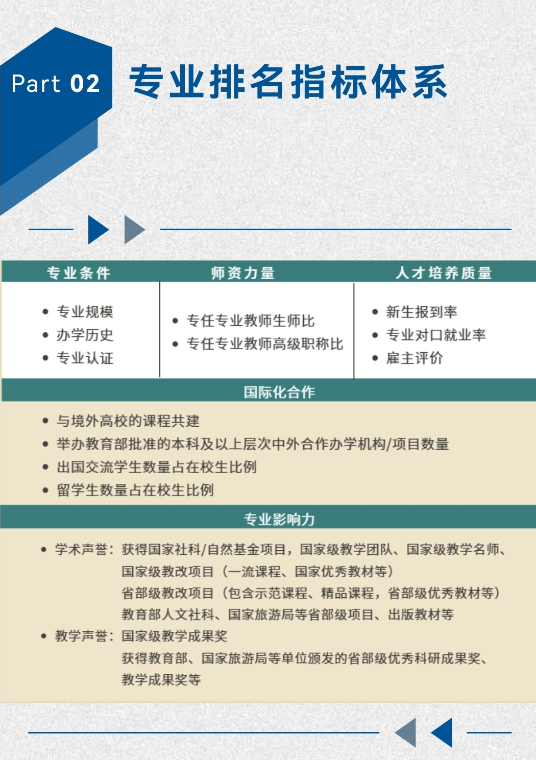 据悉,国内外现已有的学科评价指标体系偏重于所有专业的综合性评价,而对不同专业领域特殊性的理解有待进一步深化。长三角会展创新研究中心与大型会展活动专家服务基地作为国内专注于会展教育、会展产业的机构,对会展人才的培养有更加深入、更为专业的理解。该项排名是从专业条件(专业规模、专业历史、专业认证)、师资力量(专任教师师生比、高级职称比)、人才培养质量(新生报到率、专业对口就业率、雇主评价)、国际化合作、专业影响力(学术声誉、教学声誉)作为专业竞争力评价的关键性指标,因此该排名聚焦会展教育评价,是对于会展专业而言更加专业的评价和排名。