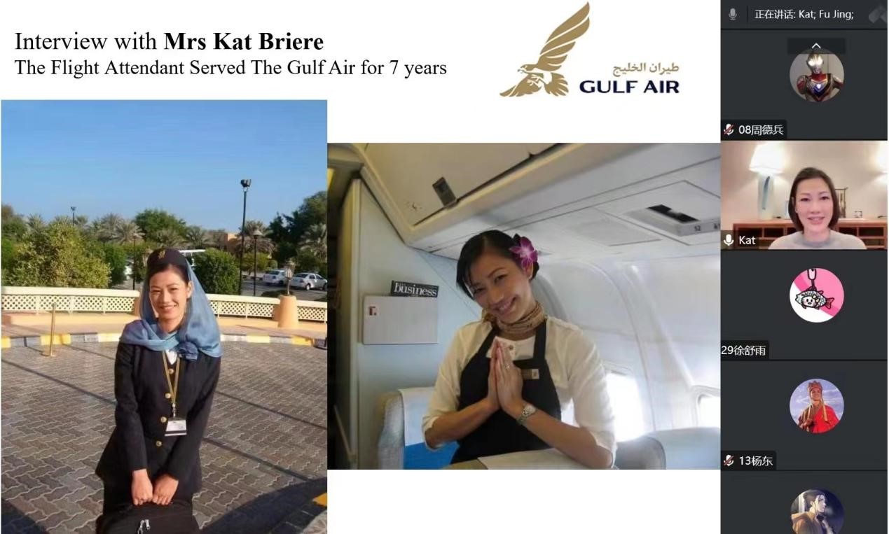 12月12日,海湾航空(Gulf Airlines)时任空乘Mrs KatBriere女士为我院师生带来“Aviation & Hospitality”的在线研讨。