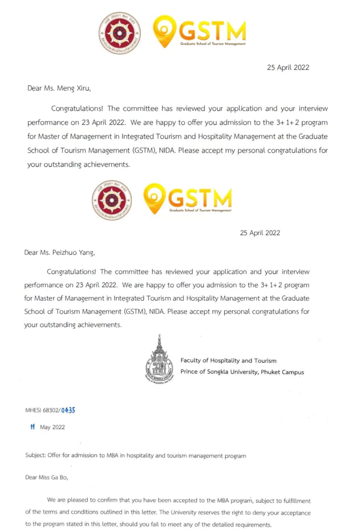 联合培养研究生项目的三封录取通知书。19级旅游管理专业孟夕茹同学、19级商务英语专业杨佩卓同学、20级旅游管理专业嘎波同学顺利通过中泰双方举行的网络面试,提前拿到研究生录取通知书。NIDA旅游管理电竞竞猜