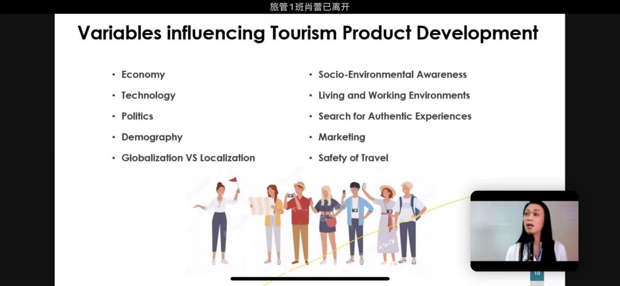 在近两小时的分享中,Wannarisa老师深入浅出地为师生们介绍了泰国旅游业的发展阶段与特色,疫情前后的主要旅游目的地的情况,游客消费动机与决策变化,产品与服务创新的影响与决定因素及后疫情时期旅游产业发展的趋势、机遇与挑战等。