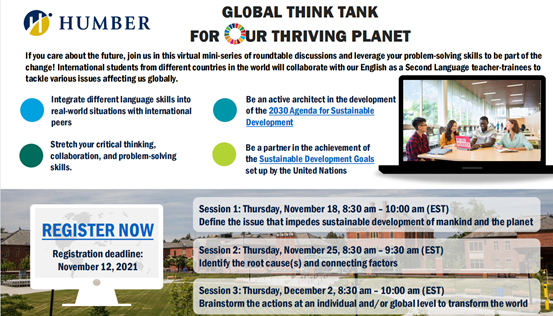 (Humber College ITAL)主办的“全球青年智库云论坛”。今年的论坛围绕着联合国可持续性发展目标(Sustainable Development Goals)展开,希望能汇聚各国青年的智慧与创意,为地球繁荣发展做贡献。