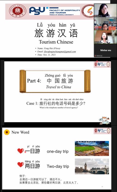 两次“云课堂”活动的授课老师冯卉(Flora)、冯玉婷(Elena),均为我校与清迈大学联合培养博士项目的全额奖学金获得者,研究领域为“跨境商务与游客购买行为研究”。两位授课老师课余从事国别(泰国)汉语推广教学数年,能熟练运用中、英、泰三语,在教授和辅导泰国青少年(YCT)及国际商务/旅游从业者(BCT)学习中文有着丰富的经验,多次应邀为泰国各级政府相关教育及商务/旅游部门、行业协会做主题讲座。