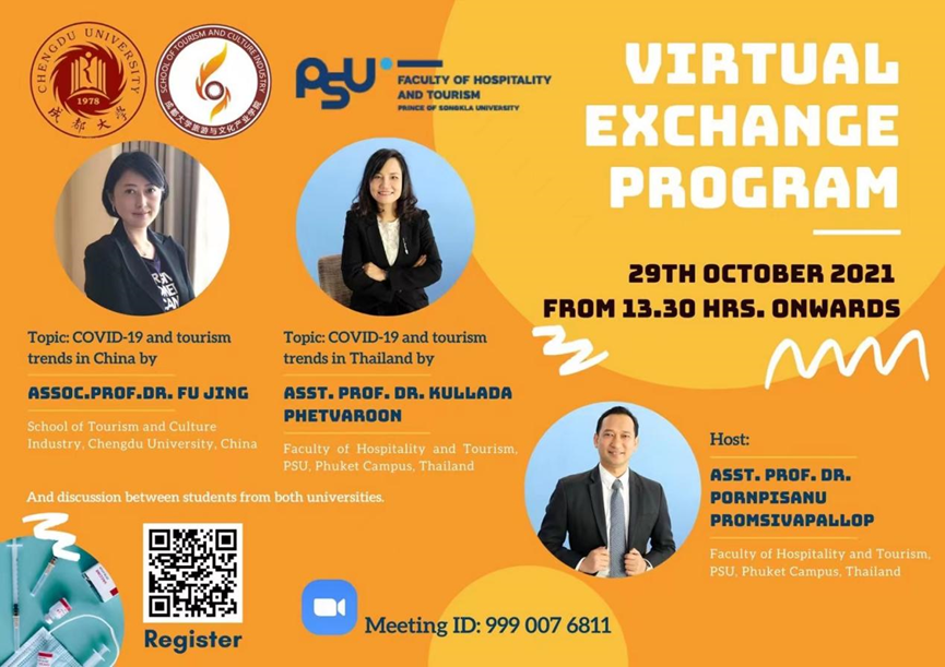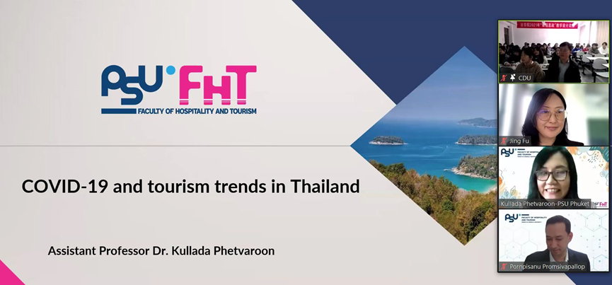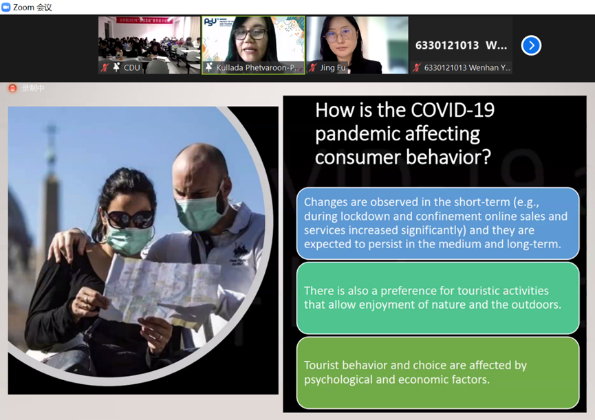 对所有参会师生表达了欢迎,并表示希望以此次论坛为契机,双方建立常态化交流机制,开展更丰富的学术活动。随后,泰方旅游管理系系主任Kullada Phetvaroom博士做了关于“COVID-19 and Tourism Trends in Thailand”的主题发言,介绍了新冠疫情对泰国旅游经济的冲击,以及吉普岛沙盒计划(Sand Box) 及其旅游发展的未来趋势。我院付静博士作为对话嘉宾,结合其在疫情期间的调研案例,做了“Tourism and Service Trends in China: challenges and opportunities in the new normal era”的主题分享。双方老师以图文并茂的讲解和精彩的对话激发出同学们的强烈兴趣,大家积极参与、踊跃提问,老师们也热情解答了同学们关于疫情下中泰旅游业如何恢复发展的诸多疑问。