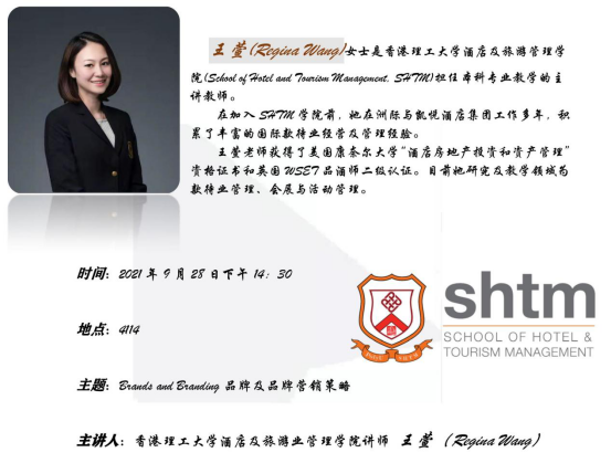 (SHTM)本科专业的主讲老师王萱(Regina Wang), 以“Brands and Branding(品牌及品牌营销策略)”为主题,为2021级新生们带来主题讲座。本次讲座由付静博士(副教授)主持,以线上与线下相结合的形式开展,吸引了我院及相关电竞竞猜
