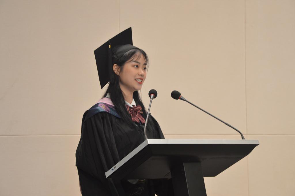 “十佳大学生”、“四川省优秀毕业生”张玉洁同学代表毕业生上台发言,她首先带领着毕业生们回顾了大学四年的时光,四年来的拼搏、努力与奋斗;四年来的欢笑与泪水。唯一的遗憾是留在校园的时日无多,不能再与亲爱的老师们一起申报课题、一起打磨项目、一起征战比赛、一起实践调研。作为即将踏入社会的学子,希望大家能够继续不负初心,再接再厉。