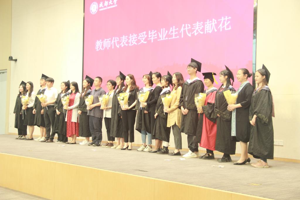 典礼颁奖环节。四川省优秀毕业生、成都大学优秀毕业生、考取硕士研究生毕业生依次上台接受颁奖;校友理事会理事、校友联络员依次上台接受聘书。毕业生代表们向教师代表们献花。