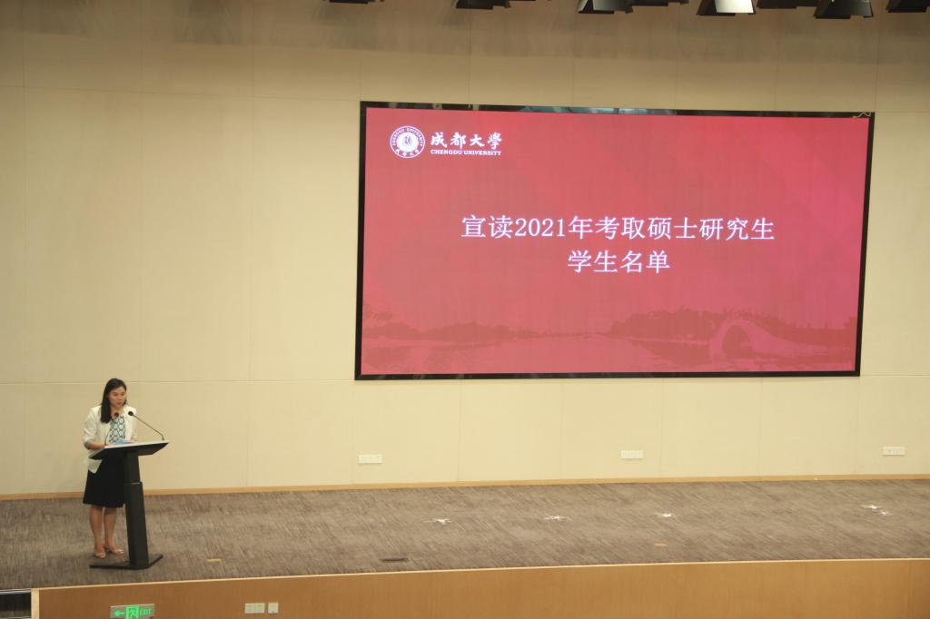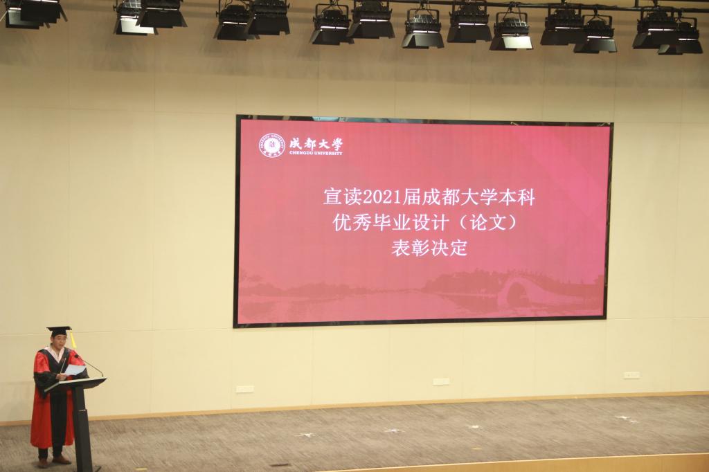 党委书记孙雁霞教授宣读2021届四川省优秀毕业生、成都大学优秀毕业生名单。