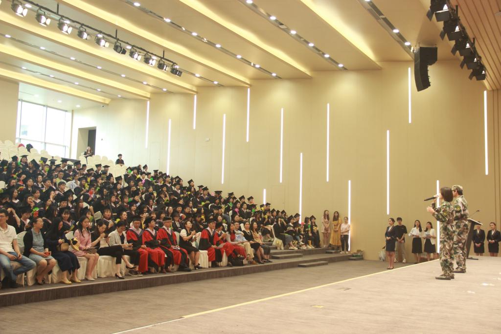 教师代表刘婕老师上台代表全体教师向毕业生们送出祝福,刘老师指出:当下的大环境充满了挑战,希望同学们能够不断提高自我,养成扩领域的学习能力、高效务实的执行能力、透彻的领悟力,去做一个创造型人才,在社会的风浪中做一个弄潮儿!