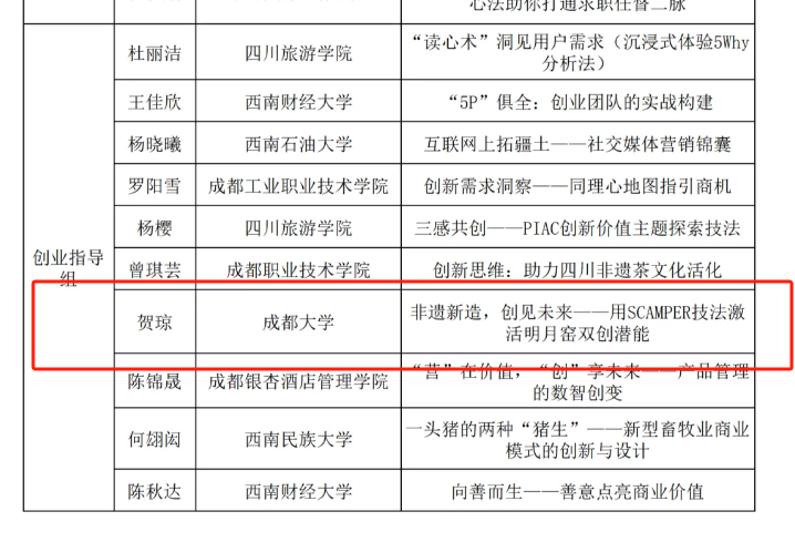 贺琼老师的课程“非遗新造,创见未来--用SCAMPER技法激活明月窑双创潜能”获评四川省2025年高校就业创业指导金课。