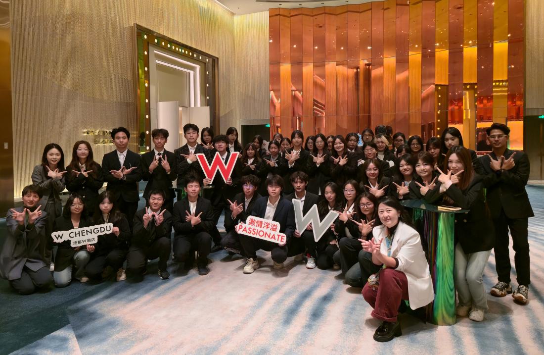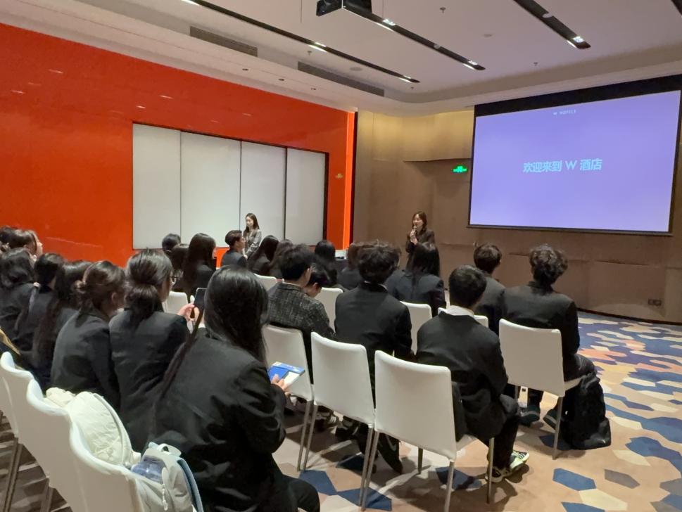 在W酒店,学生们直观感受到“随时随需”服务理念的落地实践。人力资源总监Wendy Wu女士及团队为同学们展现了这家以“潮”著称的酒店将地方文化元素巧妙融入设计和服务中,蜀绣、水墨、熊猫、麻将等成都文化符号以全新方式呈现,打破了学生对奢华酒店的刻板印象。