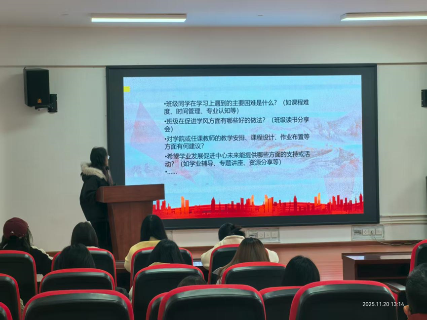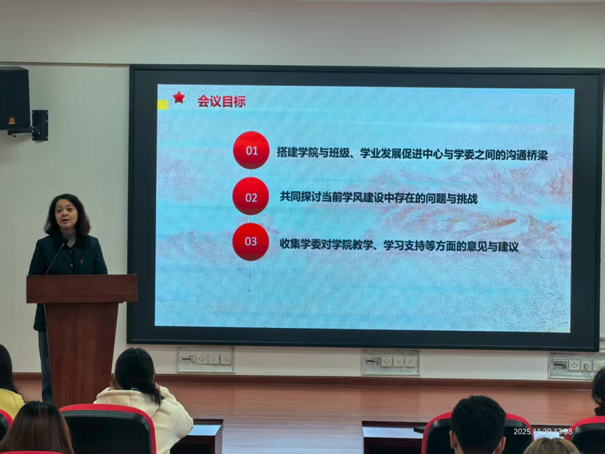 教务办老师和各班学委代表,在学促中心负责人陈璐的主持下,围绕学风建设、学委工作开展深入交流。